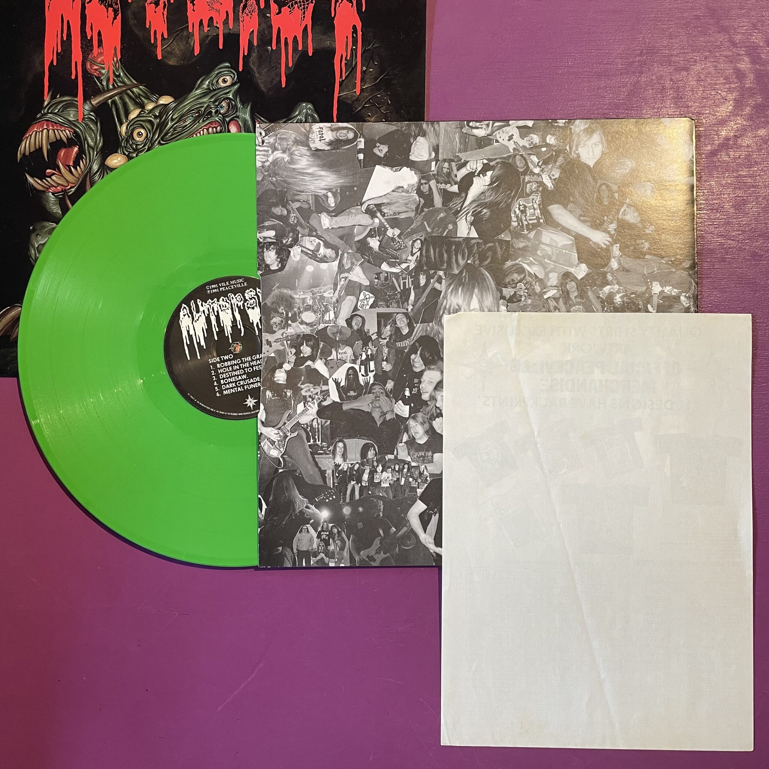 1991 Limited Edition 1 of 1000 press. Issued on green vinyl which becomes marbled when held up to the light, double sided print sleeve and a merch flyer. Would usually come with hype sticker but this copy does not. Vinyl is in excellent condition as is inner sleeve and merch sheet. Cover has edge wear as pictured.
