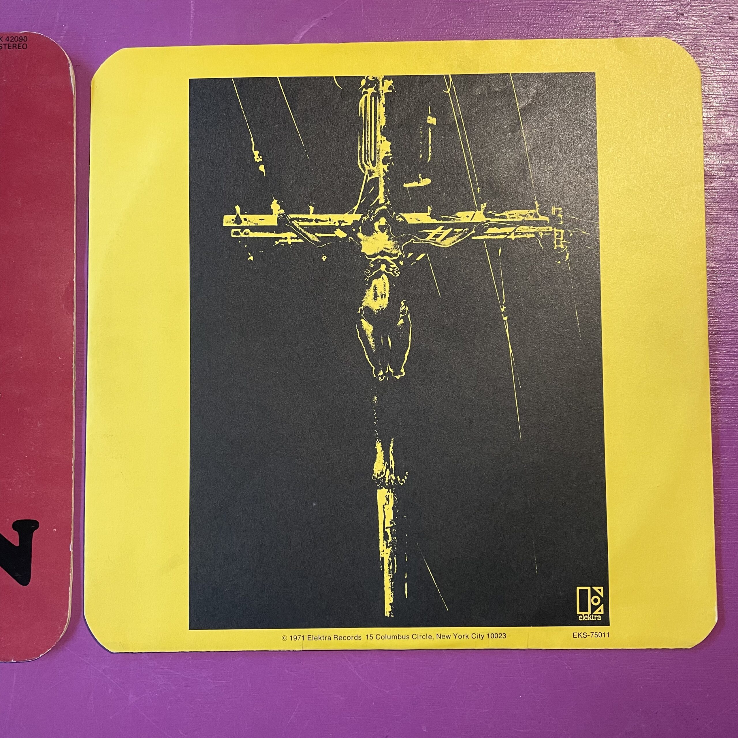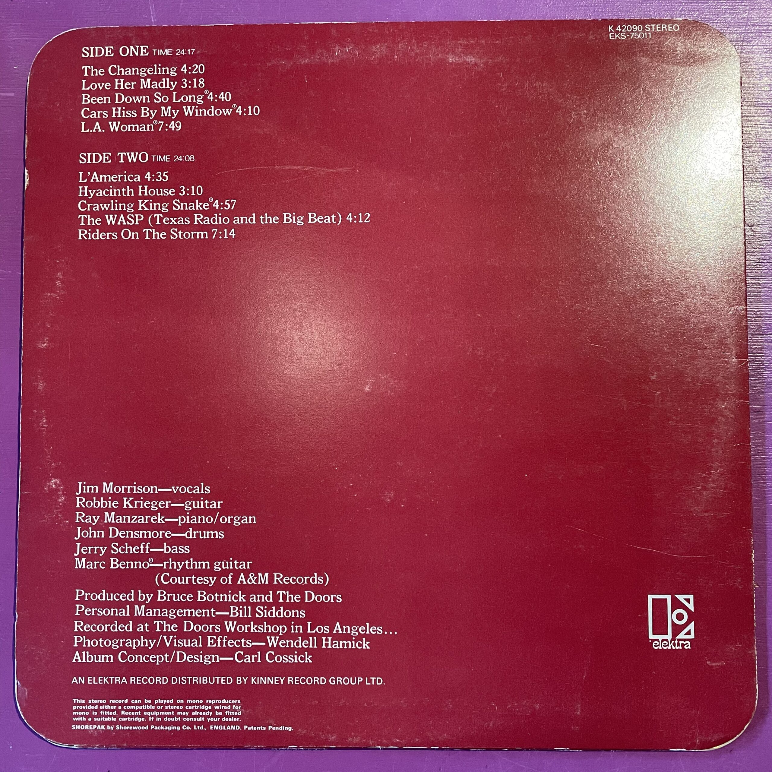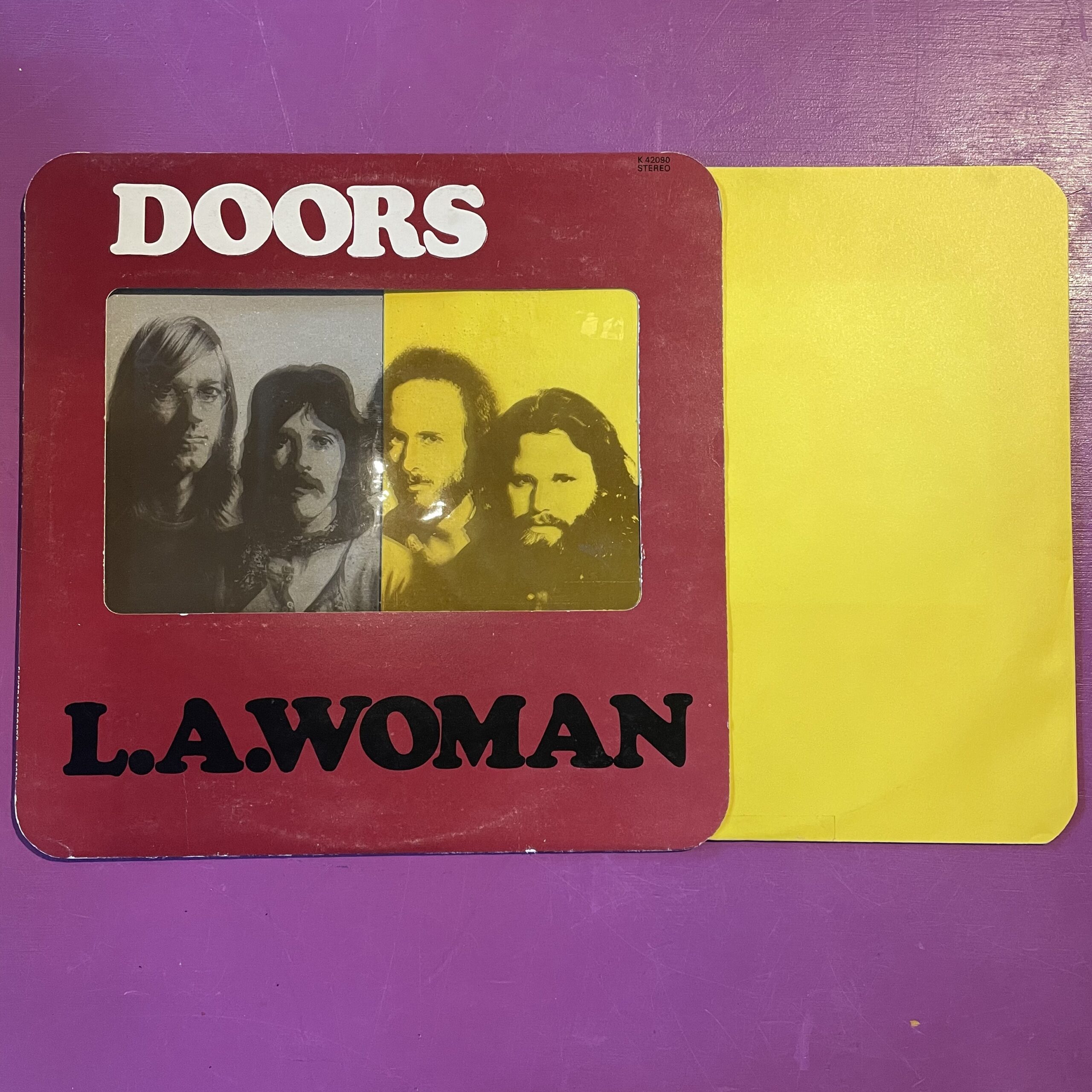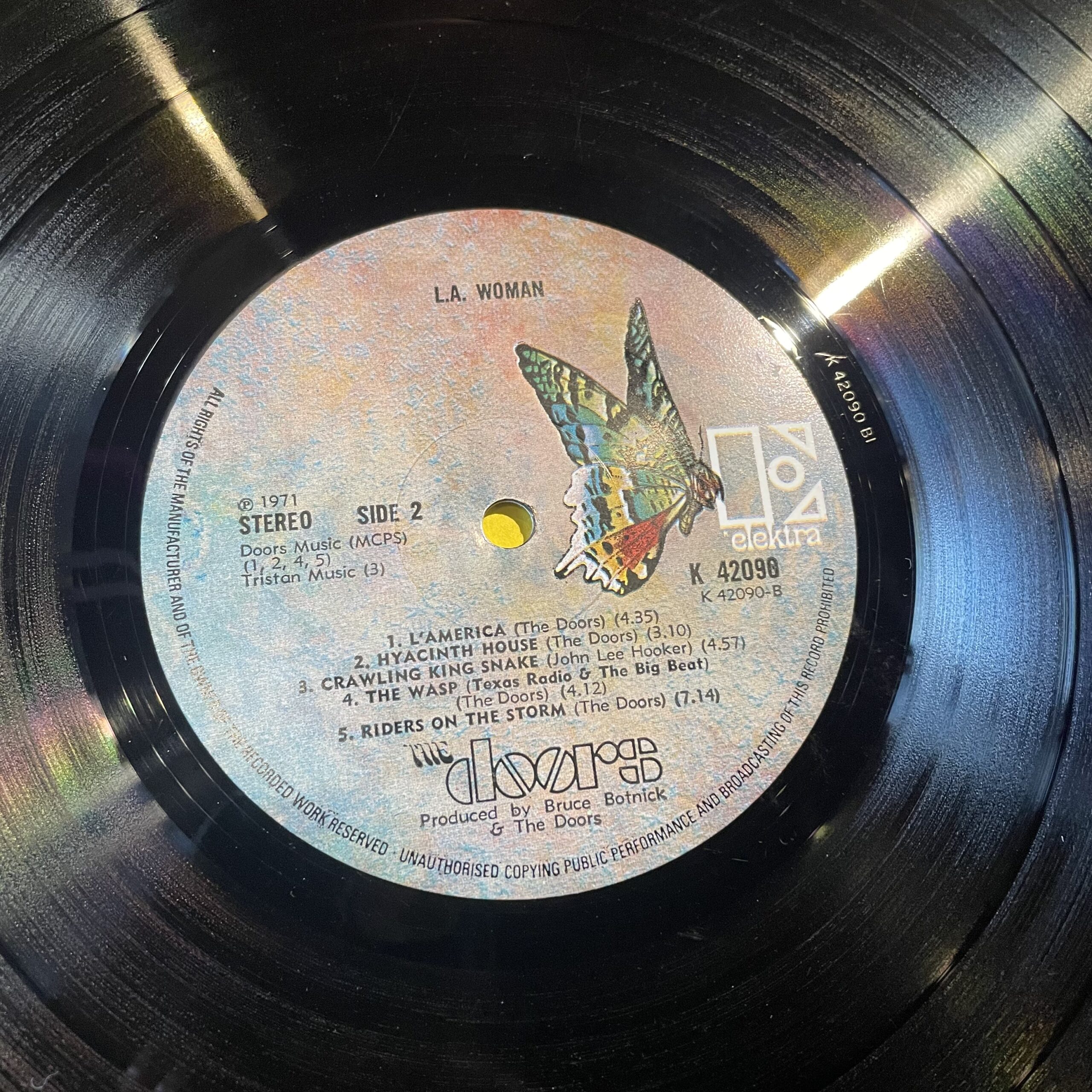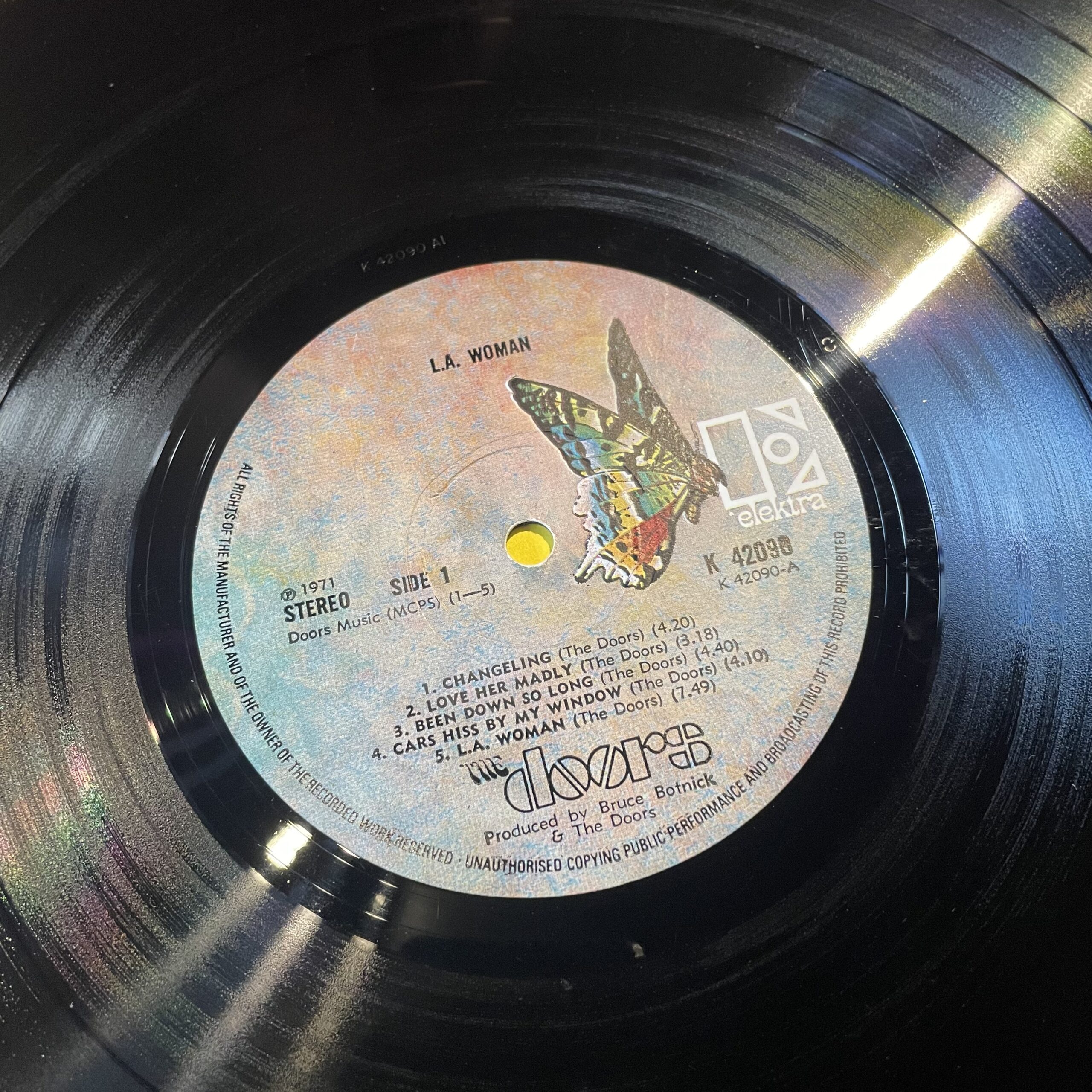 1971 UK 1st press with cellophane window and embossed ‘Doors’ logo. Sleeve has rounded corners and grey text on rear, this was changed to white on later presses. Vinyl is in fantastic condition and plays great. Inner sleeve is printed on one side and plain on the other, the plain side has a slight outline of the front cover from sun bleaching.